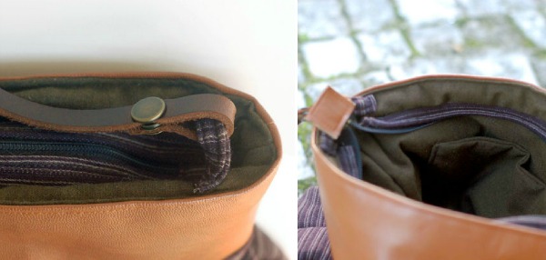 There's another clutch in the Shop, sister of this one, with purple and beige stripes, and a bar of red brown leatherette. The strap is made of dark brown leather and the lining is brown cotton.