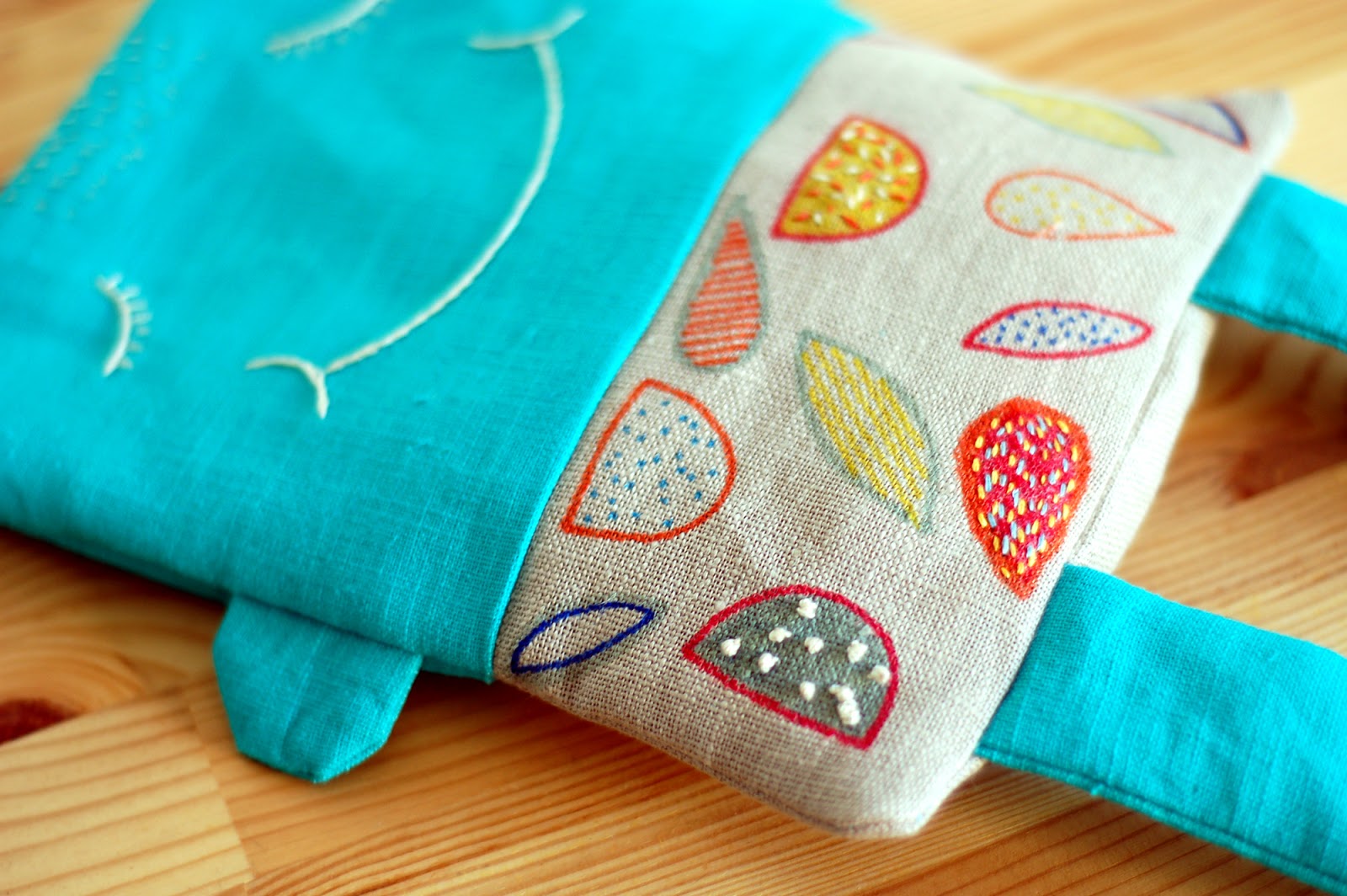 - The pencil case and bag set was a gift I prepared for Nina's friends a few months ago. Time was short and then I decided to buy them pre-made, in ecru cotton. Then I draw on them with fabric pens, and stitched some things I had at home, like buttons, beads, and embroidered details.